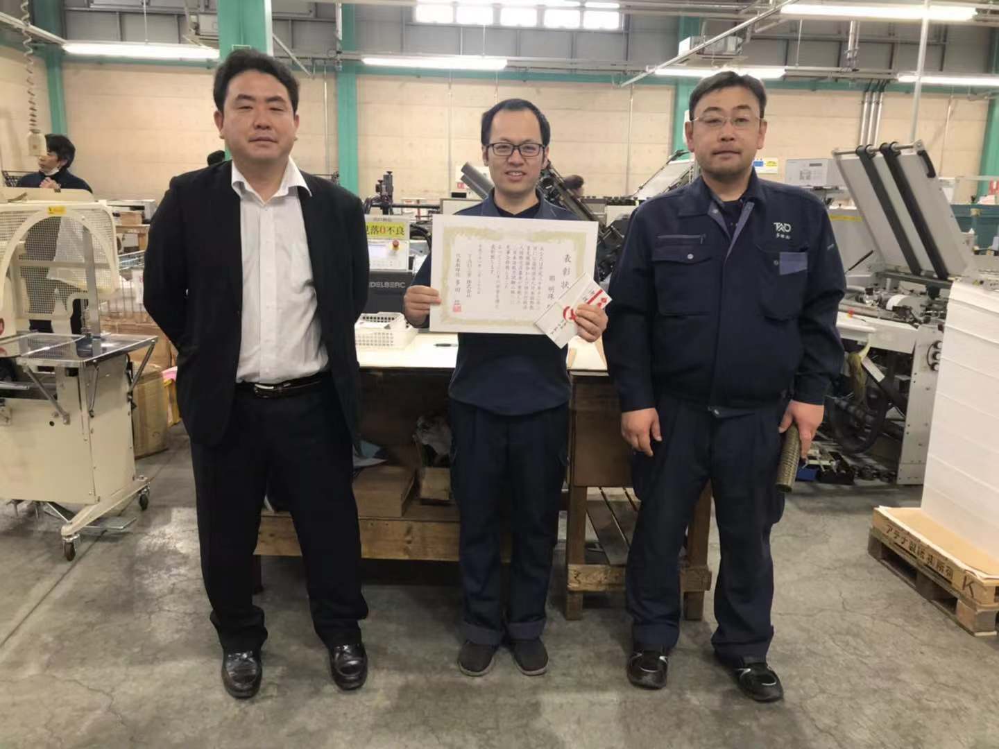 在日本兩名技能實(shí)習(xí)生順利通過(guò)日語(yǔ)二級(jí)考試,受到日方表彰,與會(huì)社領(lǐng)導(dǎo)合影留念。